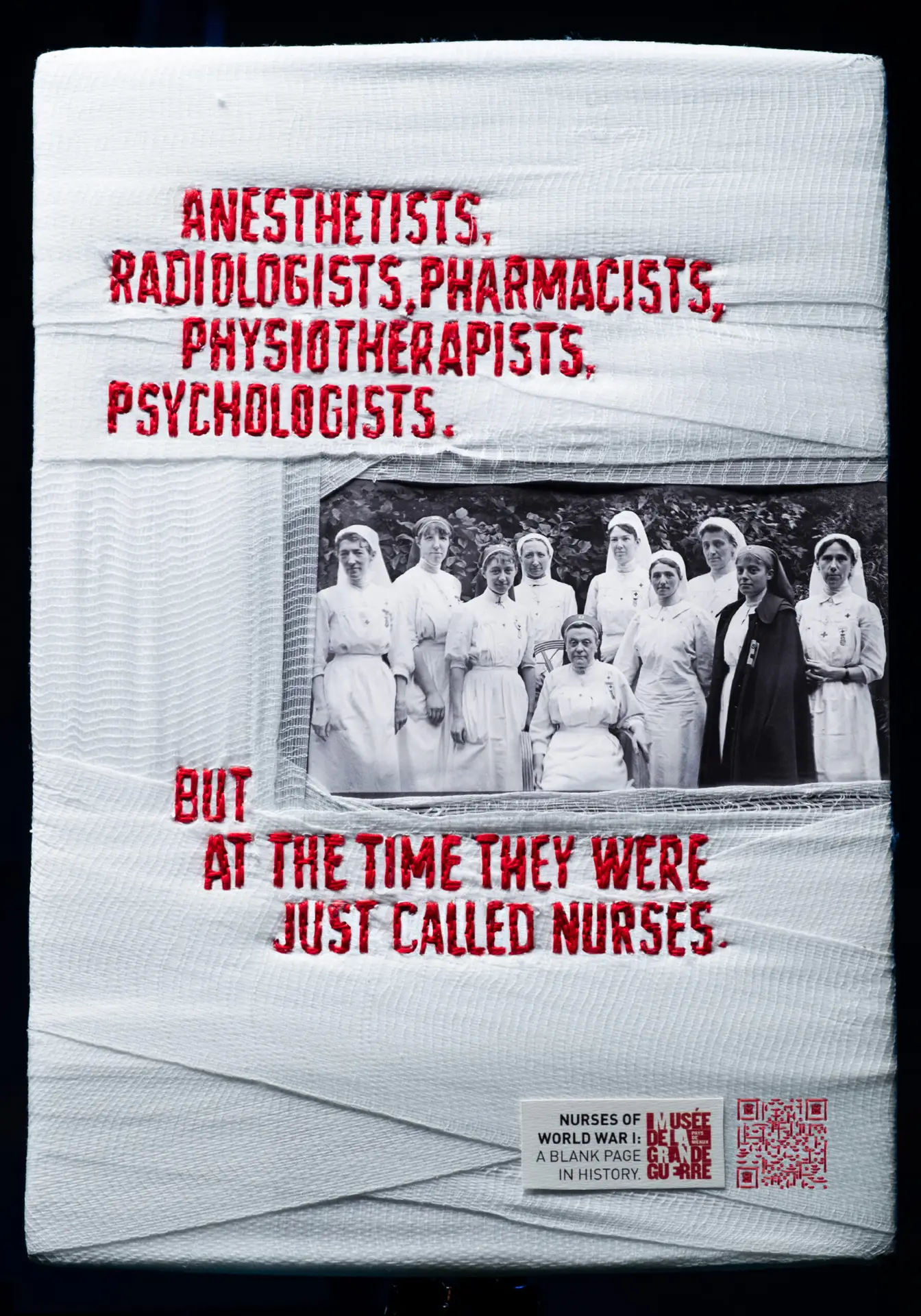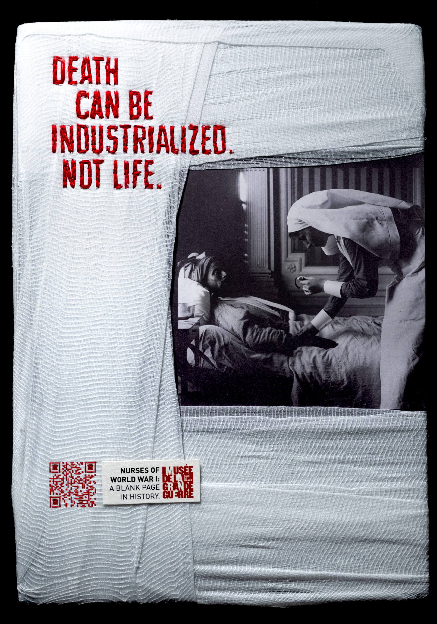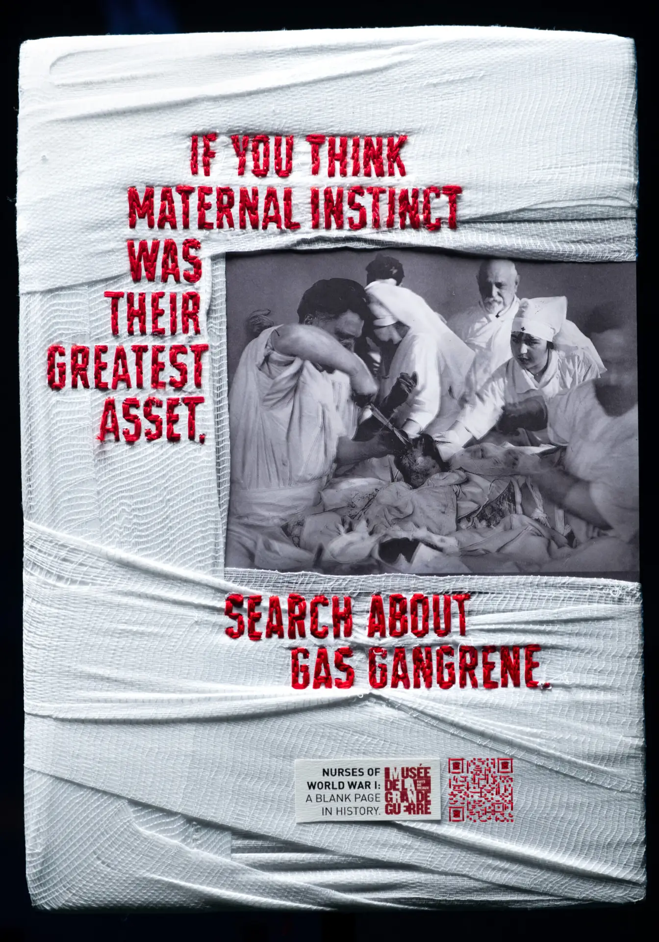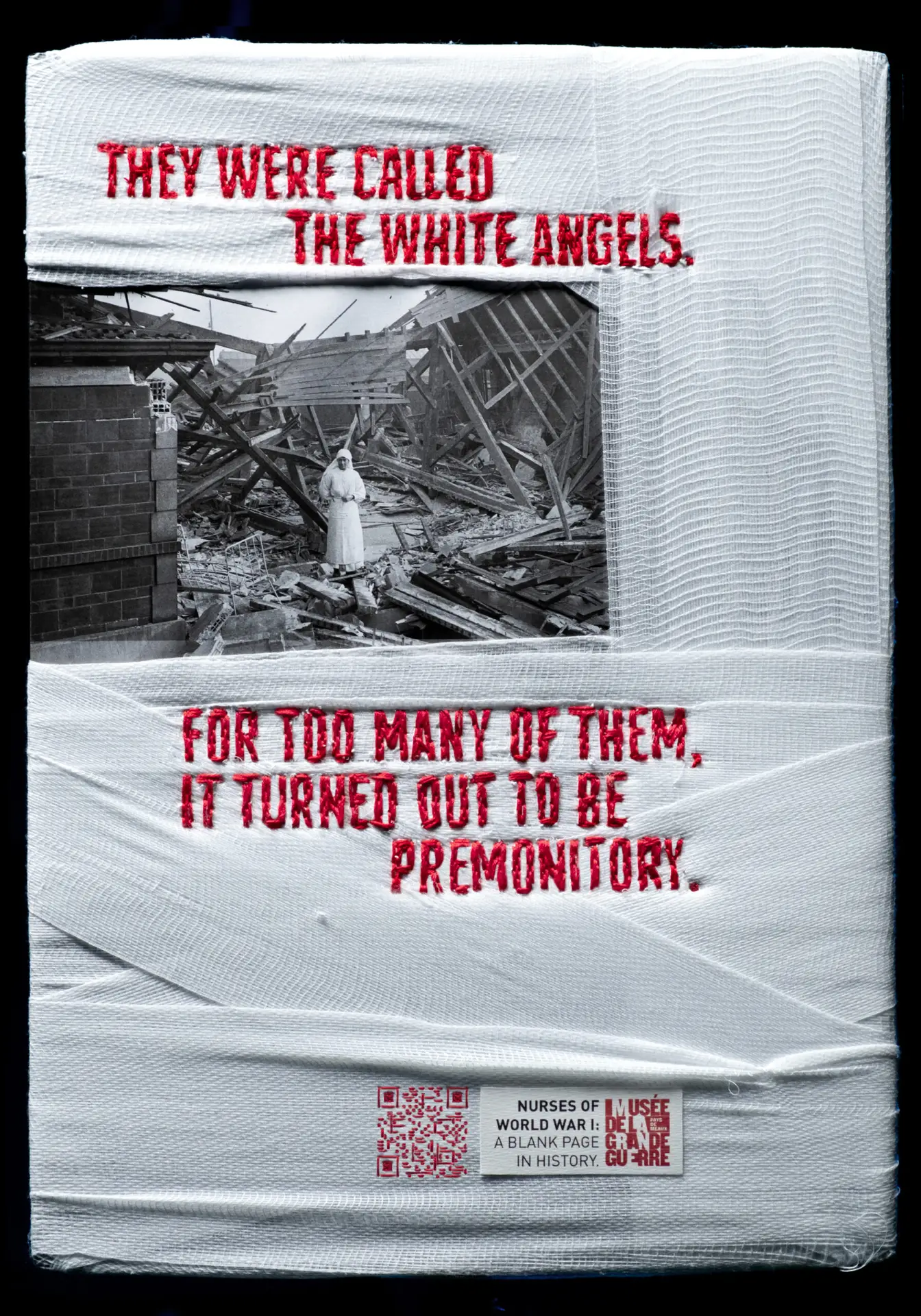 Using authentic photographic archives, the campaign visuals were physically reconstructed with bandages and thread, the very tools these nurses used during the war. Each image bears the visible marks of repair, turning craft into meaning.